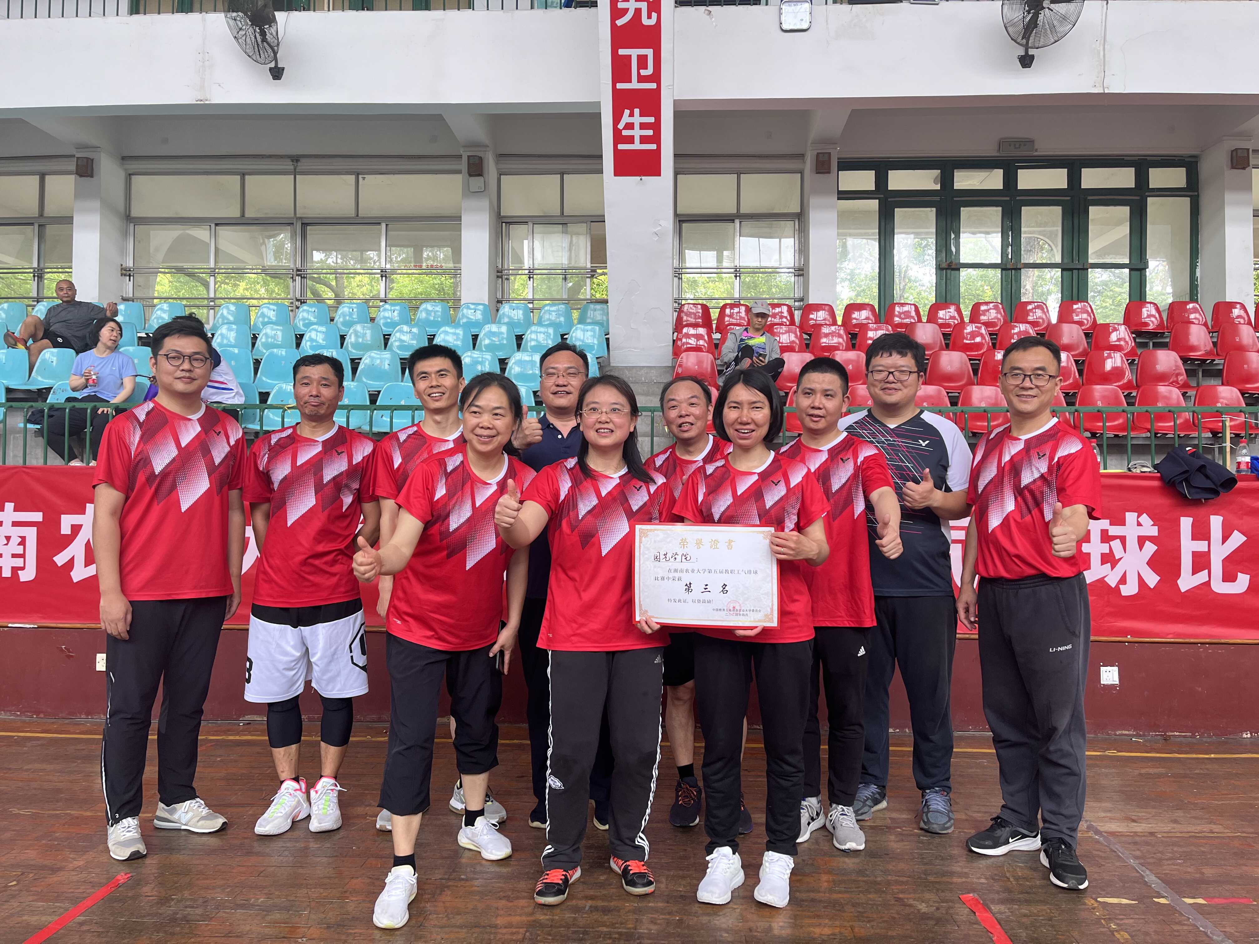 4月27日上午,在八强赛中,老师们再接再厉,继续发扬团结勇敢、越战越勇的精神,成功进入四强赛,最终,学院荣获学校第五届教职工气排球联赛第三名的好成绩。