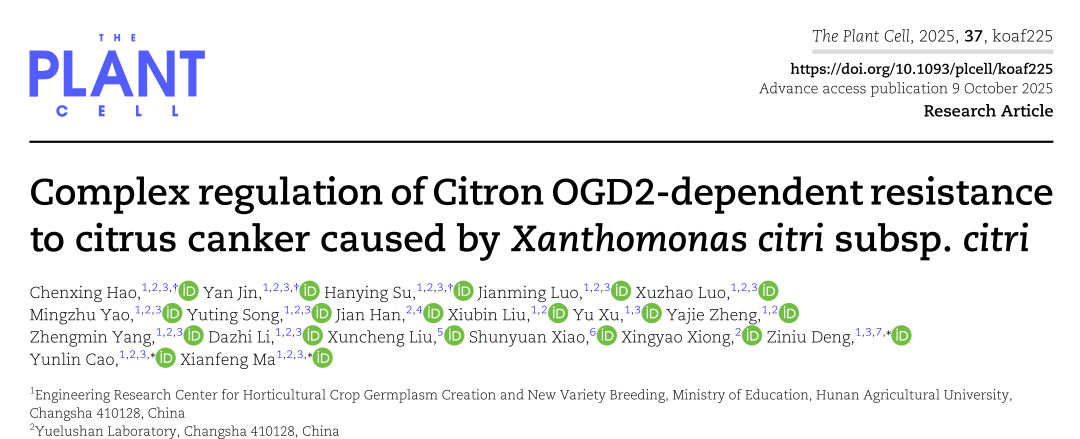 近日,beat365英国官网网站国家柑橘改良中心长沙分中心马先锋教授课题组在国际植物学权威期刊The Plant Cell上发表题为Complex regulation of Citron OGD2-dependent resistance to citrus canker caused by Xanthomonas citri subsp. citri的研究论文,揭示了柑橘抗溃疡病的新机制,为柑橘抗病育种提供基因资源与理论依据。