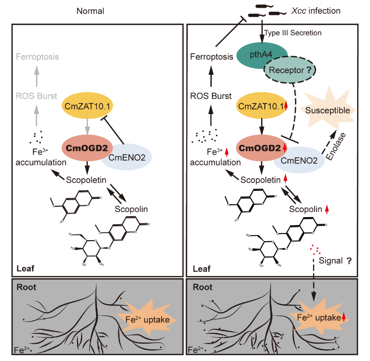 该研究鉴定到枸橼C-05中编码2-酮戊二酸依赖型双加氧酶的关键基因CmOGD2,其表达受Xcc显著诱导,且依赖于致病效应子pthAs。CmOGD2可催化香豆素类化合物scopoletin的合成,促进根部和叶片中Fe3+积累,进而引发活性氧爆发并激活铁死亡(ferroptosis)这一细胞死亡途径,从而赋予枸橼C-05对溃疡病的抗性。研究进一步揭示了OGD2依赖抗性的复杂调控机制,转录因子CmZAT10.1直接激活CmOGD2表达,而CmOGD2蛋白与烯醇酶CmENO2互作后促进CmZAT10.1蛋白降解形成负反馈调节;Xcc致病效应子pthA4可能通过诱饵机制干扰CmOGD2和CmENO2相互作用,导致CmZAT10.1蛋白积累,最终触发抗病反应。