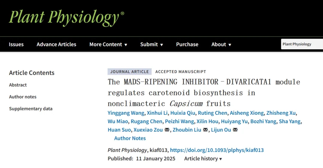 近日,邹学校院士团队欧立军教授课题组在Plant Physiology在线发表了题为“The MADS-RIPENINGINHIBITOR-DIVARICATA1 module regulates carotenoidbiosynthesis in nonclimacteric Capsicum fruits ”研究论文揭示了MADS-RIN-DIVARICATA1模块协同调控辣椒果实中辣椒红素生物合成的新机制。