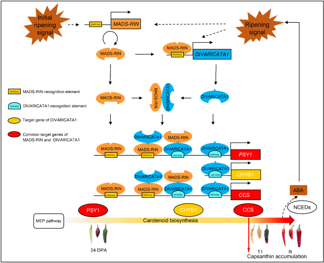 该研究通过选择三种不同转色类型的辣椒(幼果时分别为乳紫色和绿色,成熟后均为红色),基于加权基因共表达网络分色、析(WGCNA)从转录水平鉴定到一个与CCS表达高度相关的MADS-box转录因子MADS-RIN。MADS-RIN是跃变型果实番茄成熟过程的重要调节因子,能够调节乙烯合成、类胡萝卜素生物合成等生物学过程。该研究通过病毒诱导的基因沉默(VIGS)技术证明了MADS-RIN能够正调控辣椒红素生物合成;进一步研究发现MADS-RIN可以直接与类胡萝卜素生物合成基因PSY1和CCS的启动子以及转录因子DIVARICATA1的启动子结合以激活它们的表达,从而直接或间接调节类胡萝卜素生物合成。MADS-RIN和DIVARICATA1之间的物理相互作用增强了对PSY1和CCs的反式激活作用。MADS-RIN的自反式激活表明了它在特定条件下有加速上述过程的能力。同时,染色质免疫沉淀测序(ChlP-seq)揭示了MADS-RIN在番茄(跃变型)和辣椒(非跃变型)果实中潜在靶标的一致性和差异性,表明MADS-RIN在调节成熟和类胡萝卜素代谢方面的潜在保守和变异。该研究阐明了MADS-RIN-DIVARICATA1模块在辣椒中辣椒素生物合成中的调控机制,为培育高辣椒红素含量辣椒提供了靶点,为MADS-RIN在跃变型/非跃变型果实成熟和类胡萝卜素生物合成中的复杂机制提供了见解。