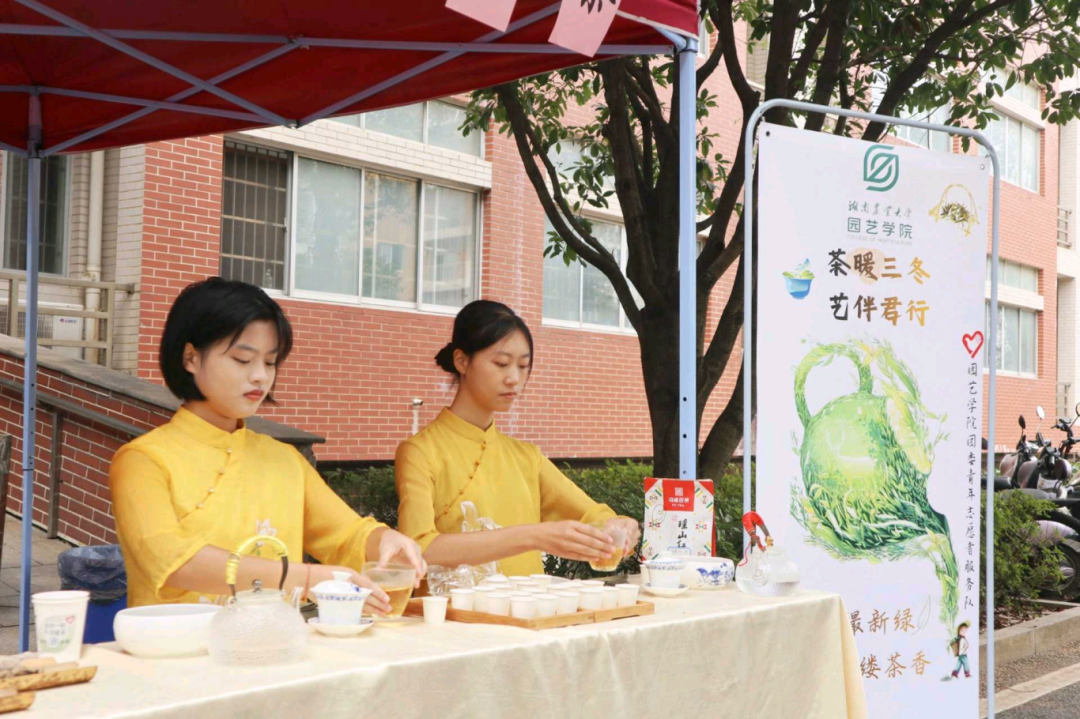 活动中,湘农茶艺队成员身着明黄服饰,以烫杯、注水、分汤等行云流水的动作展示茶艺之美。志愿者们身着“红马甲”,穿梭于自习室、办公楼与校门口,将一杯杯热茶递到师生手中,在茶香氤氲中传递问候与陪伴。此外,活动还设置了手作茶包环节,同学们亲手调配花瓣与茶叶,将冬日暖意封存回味;茶文化知识互动游戏则让参与者在趣味问答中了解茶叶品类、冲泡技艺等知识,在欢声笑语中传承茶文化。