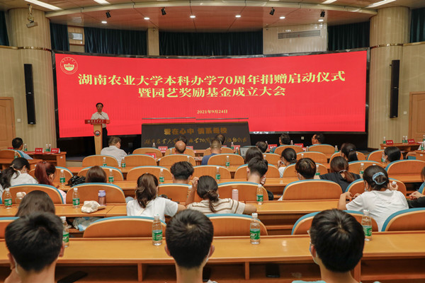 本网讯(校友办 周燕)9月24日下午,学校本科办学70周年捐赠启动仪式暨园艺奖励基金成立大会在生命科学楼国际会议厅举行。学校党委书记陈弘,中国工程院院士、校长邹学校,校党委副书记段美娟;湖南湘研种业有限公司董事长何久春,总经理刘荣云;湖南兴蔬种业有限公司执行董事张大伟,总经理邹家华;江苏镇研种业有限公司董事长卢国强;宁夏泰金种业有限公司董事长裴卓强;湖南省湘江源农业科技发展有限公司总经理邓召利;西藏绿之源现代农业科技股份有限公司总经理王真君出席仪式。学校教育基金会、beat365英国官网网站负责人及校友、师生代表参加。段美娟主持仪式。